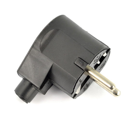 Schwarzer Netzstecker Typ E, abgewinkelte Ausführung. Ausgestattet mit einer kurzen Zugentlastung (Gummizugentlastung) und bequemen Griffen an den Seiten des Korpus. Die Steckermaße betragen 53 x 37 x 35 mm.