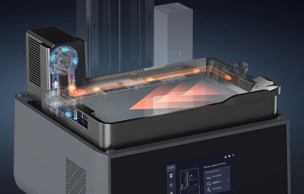 Der Drucker verfügt über eine autoadaptive Temperaturregelung, die das Harz während des Drucks unter optimalen Bedingungen hält. Dadurch passt der Photon Mono M7 Pro die Temperatur des Behälters automatisch an, was die Produktivität verbessert und die Anzahl der erfolgreichen Drucke erhöht, insbesondere bei anspruchsvolleren Materialien.