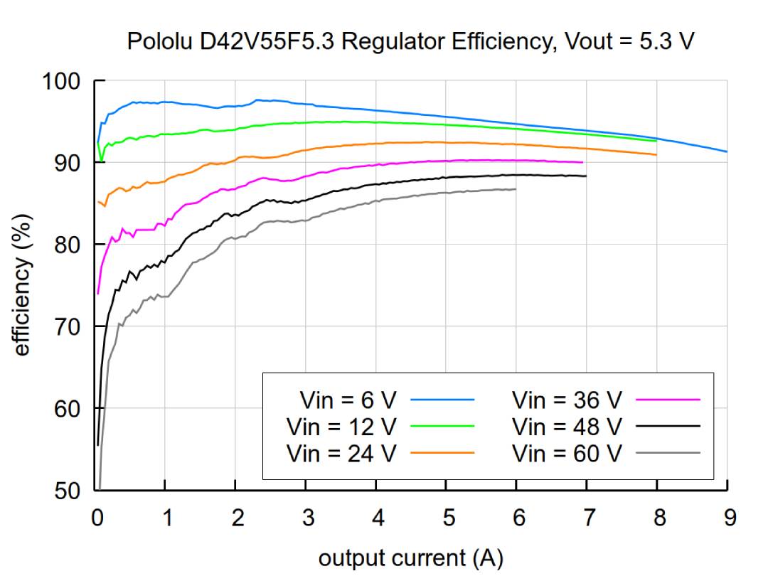Der Wandler bietet einen hohen Wirkungsgrad von 70 % bis 95 % und reduziert so Energieverluste und Wärmeentwicklung deutlich. Der maximale Wirkungsgrad wird bei optimaler Last und moderater Eingangsspannung erreicht. Der maximale Dauerausgangsstrom beträgt bis zu 6 A , sein tatsächlicher Wert hängt jedoch von Betriebsbedingungen wie Eingangsspannung, Umgebungstemperatur und Kühlmethode ab. Bei höheren Eingangsspannungen kann der verfügbare Strom aufgrund thermischer Einschränkungen geringer ausfallen.