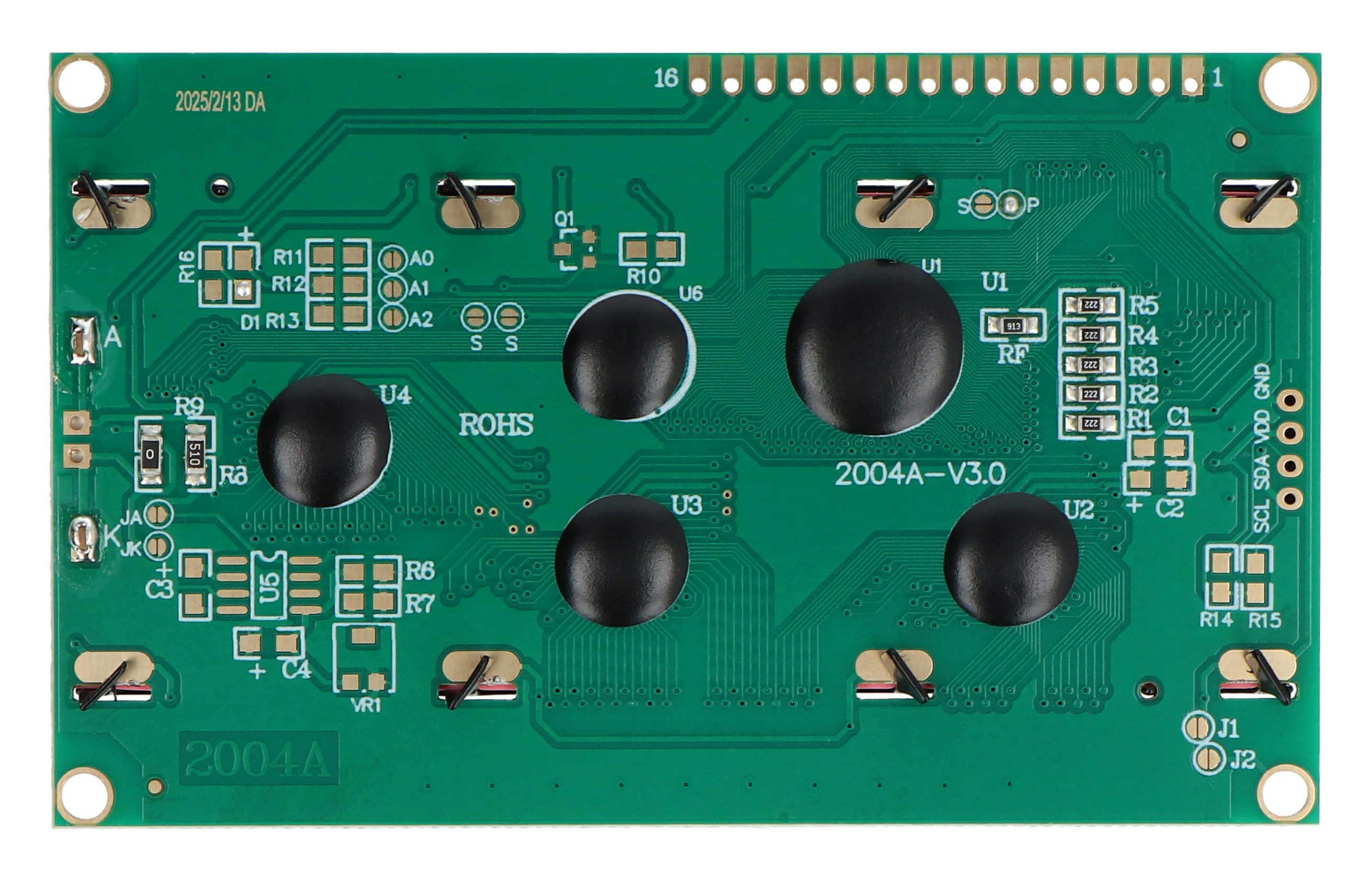 JustPi alphanumerisches LCD- Display . Es präsentiert Werte auf vier Zeilen mit jeweils 20 Zeichen . Es wird mit der Spannung von 5 V versorgt. Es zeichnet sich durch einfachste Bedienung, hohe Verfügbarkeit und zahlreiche Unterstützung für viele Mikrocontroller aus. Die Zeichen werden auf einem blauen Hintergrund angezeigt.