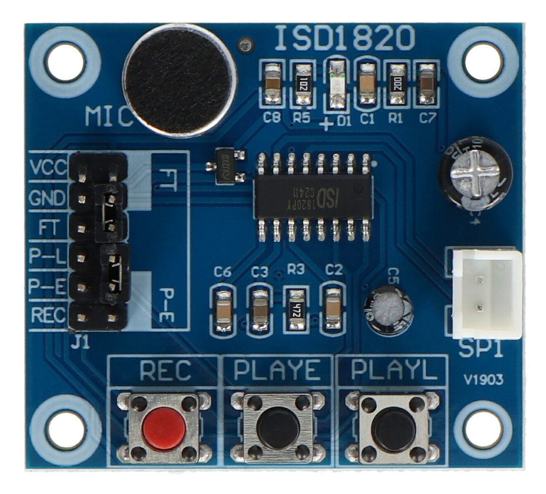 Tonaufnahme- und Wiedergabemodul auf der Basis des ISD1820-Chips. Die Versorgungsspannung liegt zwischen 3 V und 5 V. Kompatibel mit der Arduino-Plattform, kann es mit einem Mikrocontroller gesteuert werden.