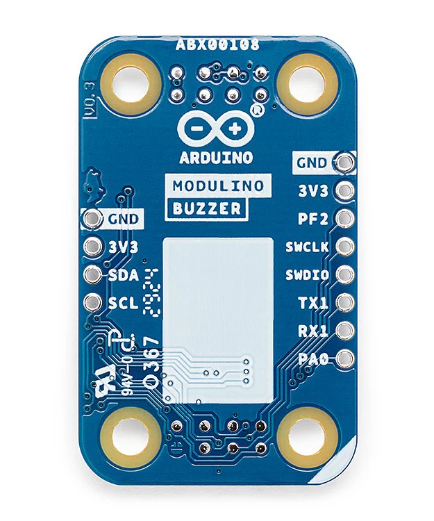Der Modulino Buzzer kommuniziert mit der Hauptplatine über die I2C-Schnittstelle mit Hilfe des praktischen Qwiic-Steckers, was den Anschluss des Moduls viel schneller und einfacher macht. Die Standard-I2C-Adresse ist 0x3C, sie kann jedoch programmatisch geändert werden, so dass mehrere Buzzer an einen einzigen Bus angeschlossen werden können. Alternativ dazu ist das Modul mit gelöteten Anschlüssen ausgestattet: GND, 3,3V, SDA, SCL, die den traditionellen Anschluss an kundenspezifische Schaltungen oder Prototyp-Kontaktplatten ermöglichen. Dank dieser Flexibilität eignet sich der Modulino Buzzer sowohl für das Rapid Prototyping als auch für dauerhafte Lösungen für IoT-Projekte.