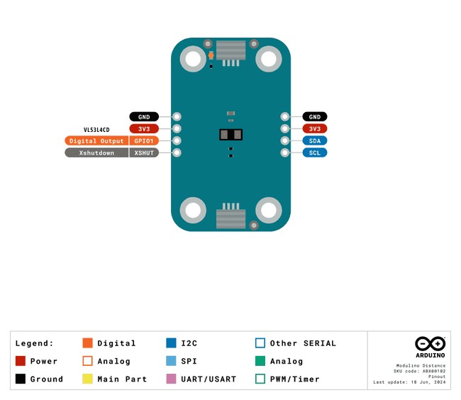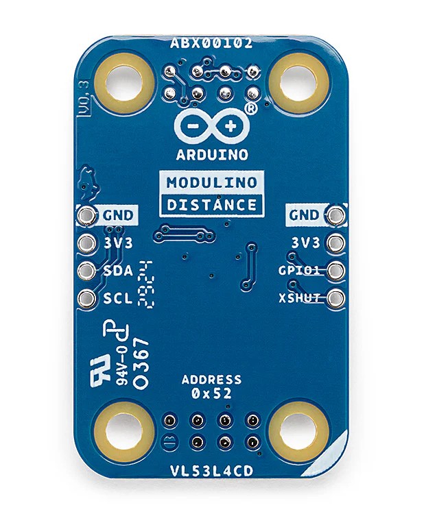 Der Modulino-Distanzsensor verwendet den I2C-Bus und eine Standardadresse von 0x29, die per Software geändert werden kann. Dank des Qwiic-Steckers ist der Anschluss an das Uno R4 WiFi-Board oder andere Arduino Nano-Boards ohne Löten möglich. Darüber hinaus ist das Modul mit vier Lötanschlüssen ausgestattet: GND, 3,3 V, SDA und SCL: Dies ermöglicht eine traditionelle Verdrahtung für kundenspezifische Projekte oder das Prototyping auf einer Kontaktplatine.