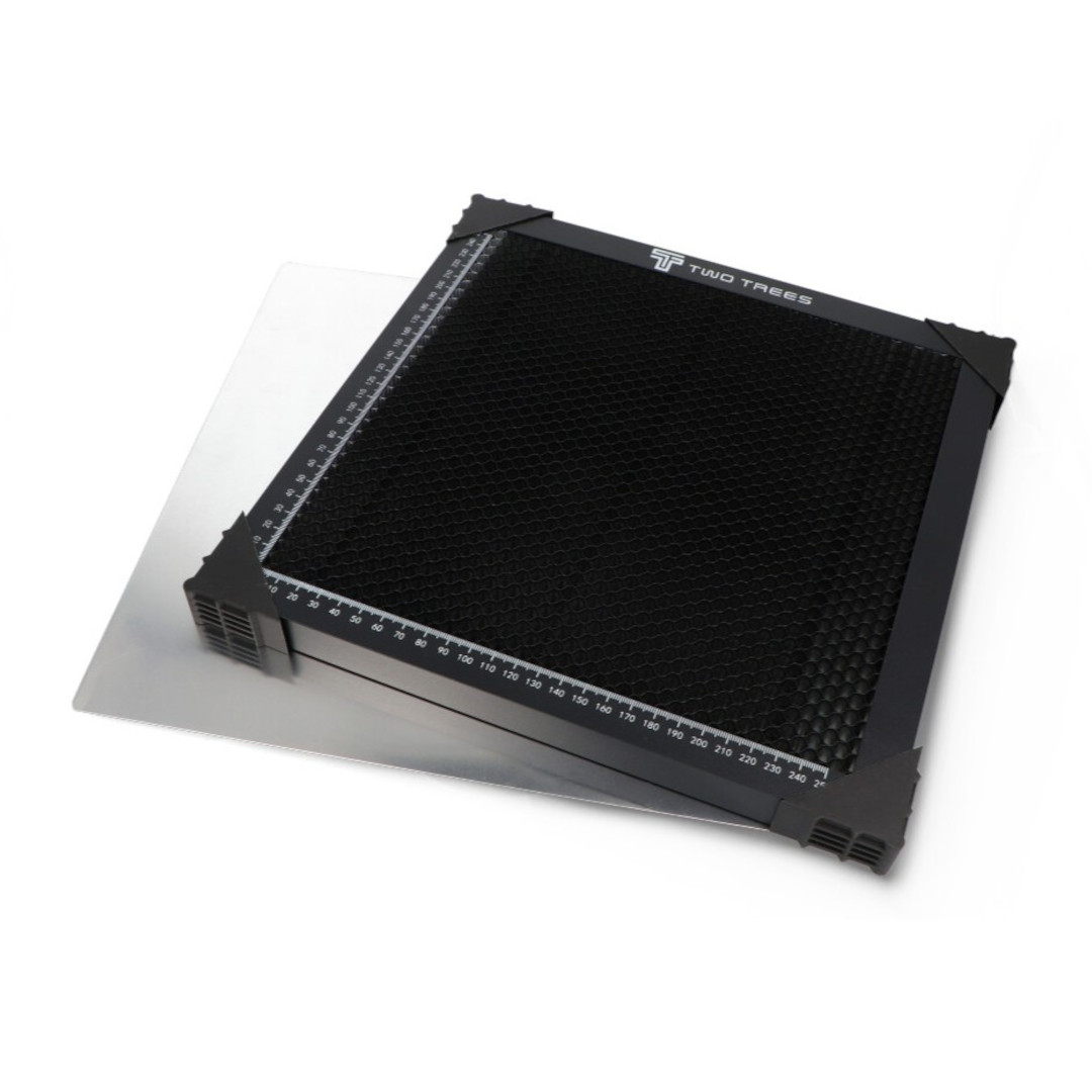 Der hochwertige Arbeitstisch von Two Trees mit den Maßen 250 x 250 x 22 mm wurde speziell für die Arbeit mit Laserschneid- und -graviermaschinen entwickelt. Dank seiner Wabenstruktur verteilt er die Wärme gleichmäßig und verhindert so eine Überhitzung des Materials, was die Schnittpräzision erhöht. Das Design erleichtert auch die Rauchableitung, wodurch das Verschmieren an den Materialkanten minimiert wird. Der robuste Rahmen sorgt für Stabilität und die angemessene Dicke (22 mm) garantiert Langlebigkeit und Verformungsbeständigkeit.