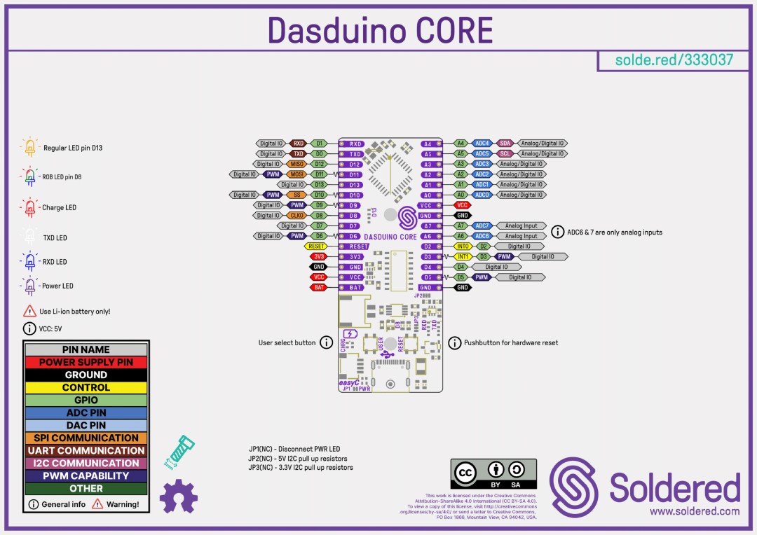 Dasduino CORE bietet bis zu 22 Pinbelegungen, die eine große Flexibilität bei der Entwicklung von Elektronikprojekten ermöglichen. Es gibt 14 digitale Pins, von denen einige PWM-Funktionen unterstützen, und 8 analoge Eingänge, einschließlich der speziellen Pins A6 und A7, die nur für analoge Lesevorgänge vorgesehen sind. Der easyC-Anschluss ermöglicht den sofortigen Anschluss zusätzlicher Module ohne Löten, und der USB-Typ-C-Anschluss vereinfacht die Integration mit einem Computer oder einer Powerbank.