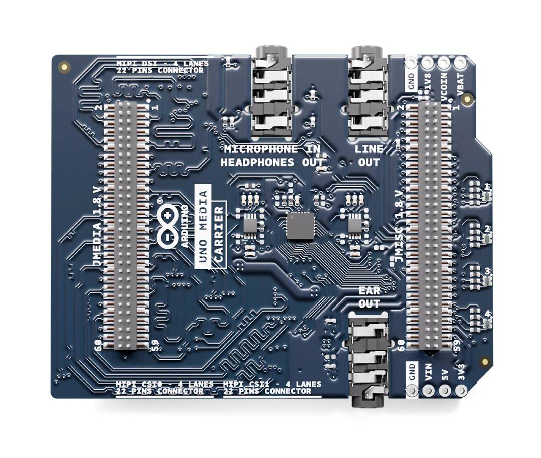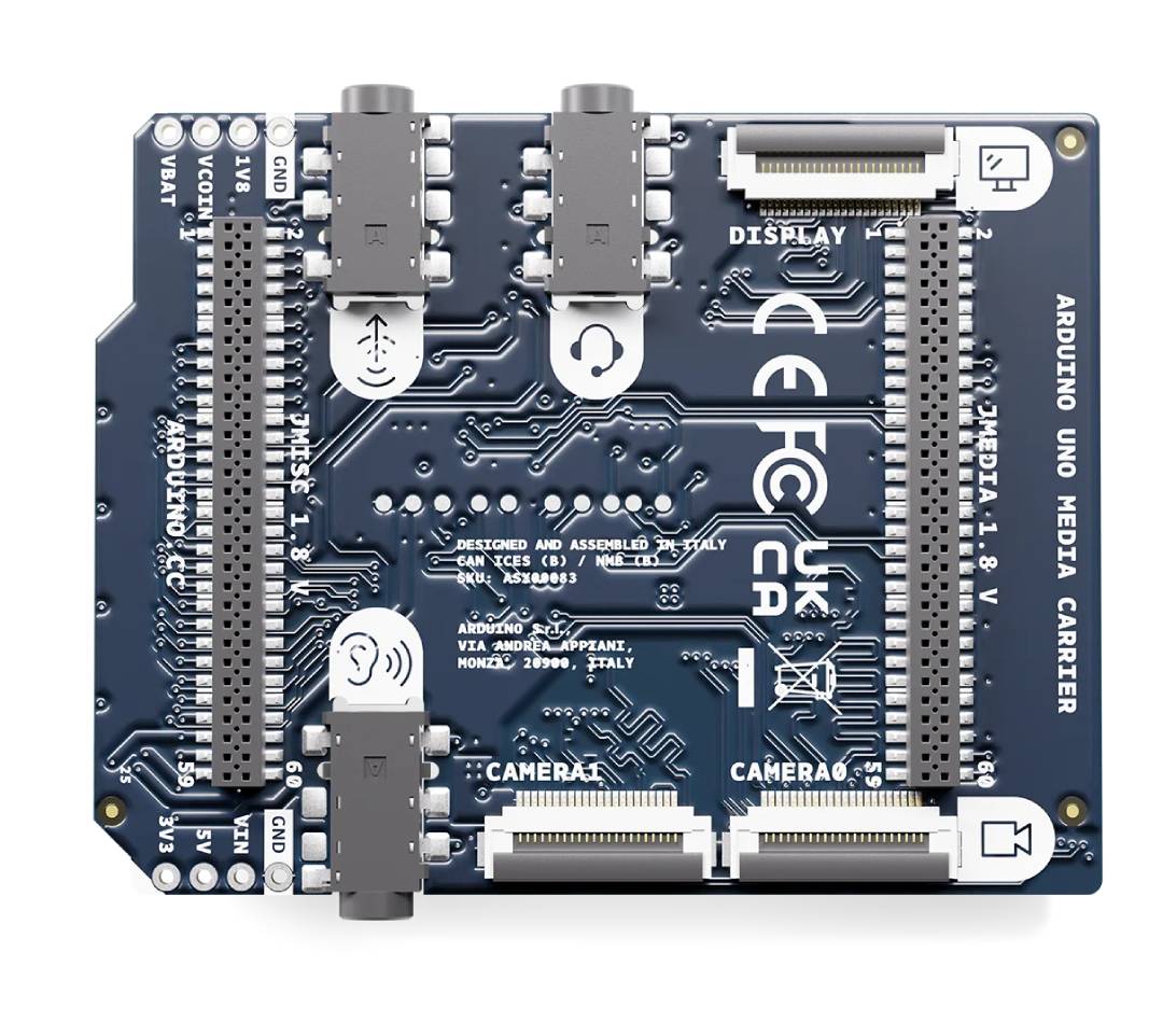 Das Arduino UNO Media Carrier Shield erweitert UNO Q und VENTUNO Q schnell und einfach um hochwertige Video- und Audiofunktionen. Das Modul wird über JMEDIA- und JMISC- Anschlüsse mit der Basisplatine verbunden. Dank ihrer Durchgangskonstruktion können mehrere Module gestapelt werden, ohne die Pins der Haupteinheit zu blockieren. Es verfügt über zwei 22-polige 4-Lane-MIPI-CSI- Kameraanschlüsse , einen 22-poligen 4-Lane-MIPI-DSI- Displayanschluss und drei 3,5-mm-Klinkenbuchsen . Diese Lösung eignet sich ideal für die Entwicklung von KI-Systemen, HMI-Geräten, interaktiven Installationen und Produktprototypen mit Video- und Audioanalyse.