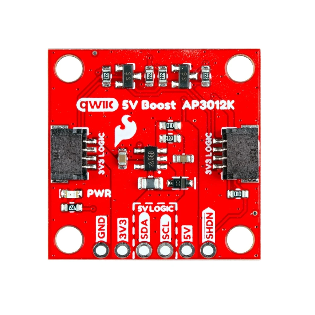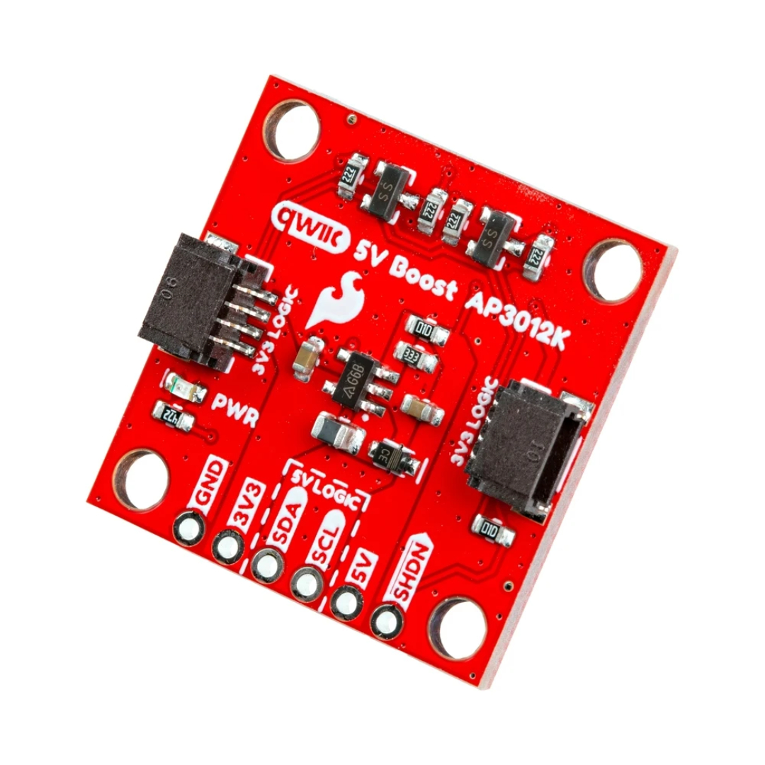 Qwiic 5V Boost ist ein universelles Board, das die Kompatibilität von Qwiic-Systemen mit 5-V-Geräten erweitert. Basierend auf dem AP3012 Inverter, erhöht das Modul 3,3 V vom Qwiic-Bus auf 5 V und stellt diese über Lötpins zur Verfügung. Darüber hinaus ermöglichen eingebaute Logikpegelwandler die Konvertierung von I2C-Signalen, und über eine Reihe von Jumpern können Spannungspegel und Pull-up-Widerstände unabhängig voneinander eingestellt werden. Dies ist ideal für die Integration von Geräten wie SPS30, SEN54-Sensoren, Lüftern oder LED-Beleuchtung mit 3,3-V-Mikrocontrollern.