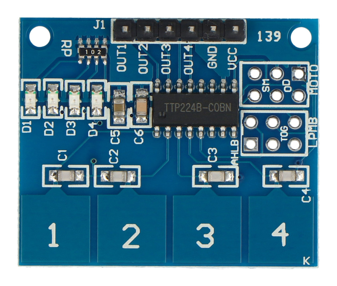 Kapazitiver Berührungssensor auf der Basis des TTP224-Moduls. Es wird mit 2,4 V bis 5,5 V versorgt, der Ausgang ist ein digitales Signal. Es hat 4 Tasten mit LED-Anzeige.