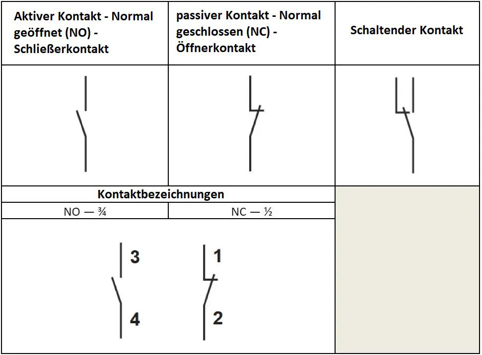 - Hilfskontakte: zweistellige Bezeichnungen, wobei die erste Ziffer die Nummer des nächsten Kontakts ist und die zweite Ziffer die Art des Kontakts angibt (1-2 NC-Kontakt, 3-4 NO-Kontakt).