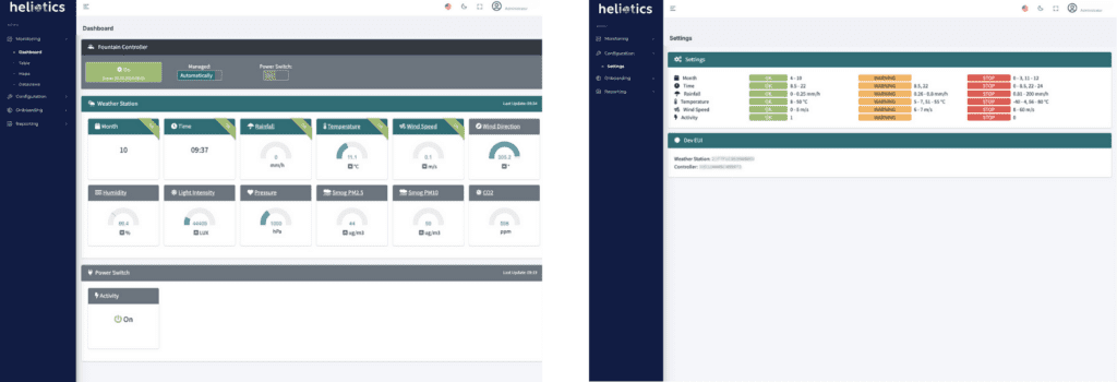 Diese Lösung steuert automatisch die Ein- und Ausschaltzyklen des Springbrunnens auf der Grundlage vordefinierter Schwellenwerte (z.B. niedrige Temperaturen, starker Wind oder starke Regenfälle) und gewährleistet so einen optimalen Betrieb. Die Logik des Systems basiert auf einer Farbskala (grün für günstige Bedingungen, gelb für Vorsicht, rot für Abschaltung), so dass die Fontäne bei ungünstigen Wetterbedingungen automatisch abgeschaltet und bei besseren Bedingungen wieder gestartet werden kann – und das in weniger als 10 Sekunden.