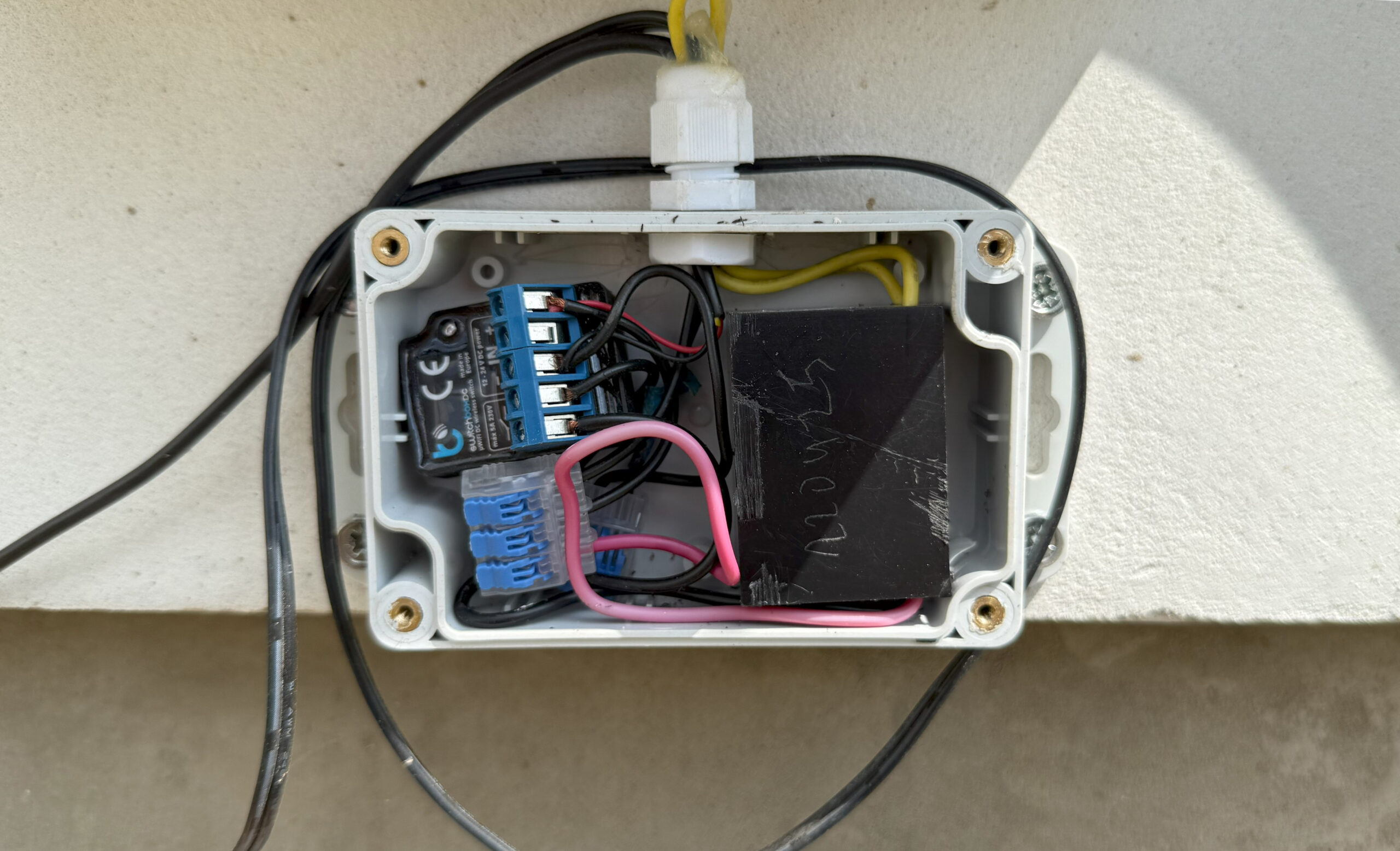 - Stromversorgung und Sicherheit – die Stromversorgung sollte eine ausreichende Leistung haben – mindestens 2 A bei 12 V DC. Alle Anschlüsse sollten sorgfältig ausgeführt werden, vorzugsweise in luftdicht verschlossenen Kästen oder Schaltschränken. Es lohnt sich auch, eine Sicherung in die Stromleitung einzubauen. Hier gab es keine andere Möglichkeit, als das Netzteil direkt in eine luftdichte Steckdose zu stecken, die sich in der Nähe des Wasserhahns befindet.
