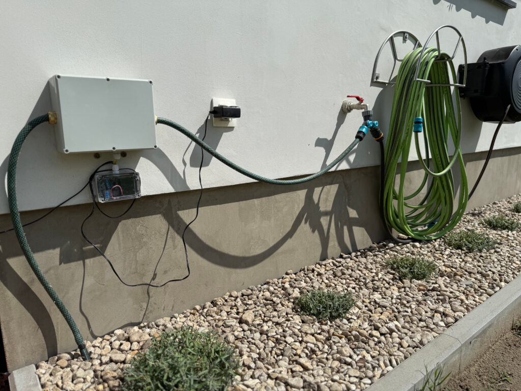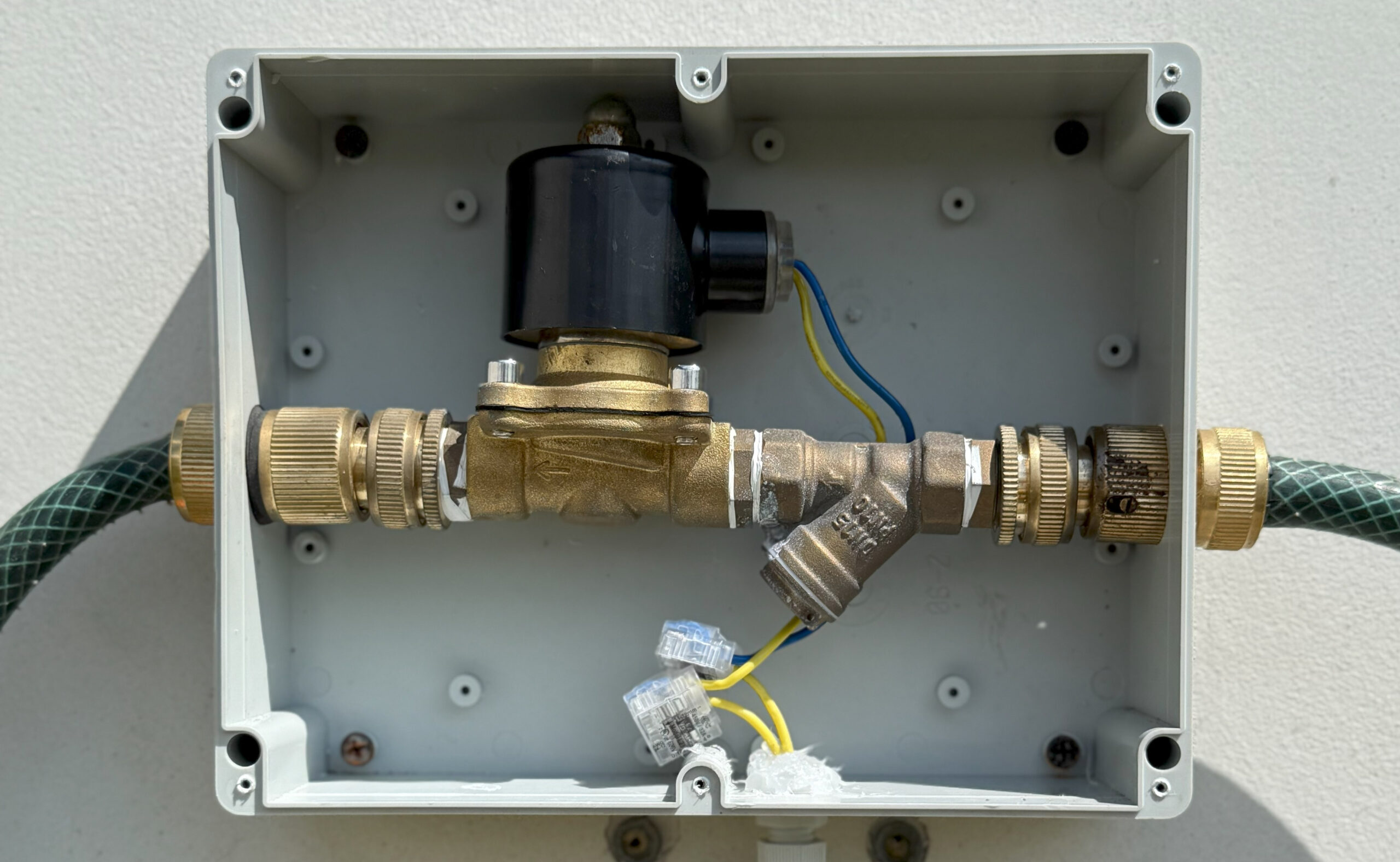 - Montage des Elektroventils – Das Elektroventil sollte an der Wasserzuleitung zum Bewässerungssystem montiert werden. Idealerweise sollte es ein Kunststoff- oder Metallrohr mit einem 1/2-Zoll-Gewinde sein. Das Magnetventil sollte an einem leicht zugänglichen Ort montiert werden, vorzugsweise in einem luftdichten Gehäuse (hier wurde leider ein Gehäuse ohne klassifizierten IP-Schutz verwendet), um es vor Feuchtigkeit und Schmutz zu schützen. Dieses Design verfügt außerdem über einen Wasserverteiler, an den gleichzeitig ein Gartenschlauch angeschlossen werden kann. So können Sie Ihren Garten manuell bewässern oder das Wasser unabhängig von der Automatisierung nutzen, ohne die Anlage demontieren zu müssen.