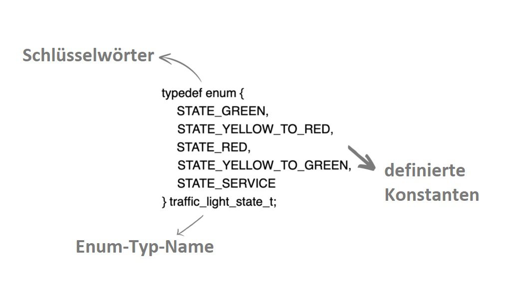 Bevor wir uns jedoch dem Code zuwenden, müssen Sie eine weitere Neuheit der Sprache C kennenlernen, den so genannten Aufzählungstyp, der es uns ermöglicht, die Zustände zu beschreiben, in denen sich eine Signalleuchte befinden kann.