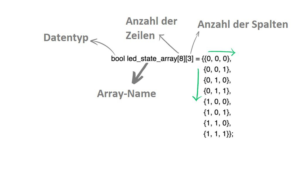 Im Vergleich zur letzten Einsetzung des Arrays ist die Struktur dieses Befehls leicht erweitert worden. Beachten Sie zunächst, dass auf den Namen des Arrays zwei eckige Klammern folgen, in denen wir die Dimensionen des Arrays angeben, also die Anzahl der Zeilen und Spalten. In unserem Programm werden wir immer noch drei LEDs ansteuern, also wird das Board drei Spalten haben. Die Anzahl der Zeilen wird dagegen acht betragen, um alle möglichen Zustände der drei Elemente zu nutzen. Wenn Sie sich die Zustände ansehen, werden Sie in den folgenden Zeilen des Arrays feststellen, dass sie fortlaufenden Zahlen im Binärcode entsprechen. In einem auf diese Weise vorbereiteten Array wird jedes Element durch seinen eigenen Index beschrieben, der der Zeile und Spalte entspricht. Spalten werden, wie im vorherigen Beispiel erwähnt, von links nach rechts angegeben, während Zeilen von oben nach unten angegeben werden.