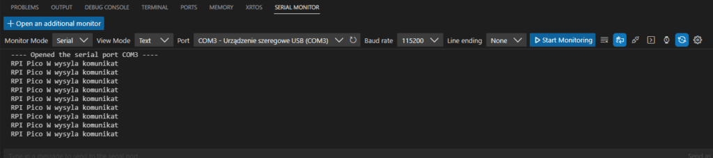 Nachdem Sie das Projekt erstellt und die Datei .uf2 in den RPI-Speicher hochgeladen haben, meldet sich das Board als serielles USB-Gerät unter einem der COM-Ports. Details können Sie im Gerätemanager einsehen. Wenn Sie die vom Mikrocontroller gesendeten Nachrichten überprüfen möchten, können Sie ein beliebiges Programm verwenden, mit dem Sie die seriellen Schnittstellen verwalten können, oder Sie nutzen die in Visual Studio Code integrierte Funktionalität für diesen Zweck. Unten finden Sie den SERIAL MONITOR, den Sie öffnen können, um verschiedene Optionen zu sehen. Die wichtigste davon ist Port. Hier wird der RPI unter dem Namen USB Serial Device angezeigt, in meinem Fall dem COM3-Port zugewiesen. Da es sich hierbei um einen virtuellen seriellen Anschluss handelt, brauchen wir die anderen Optionen nicht zu beachten. Wenn Sie auf die Schaltfläche Überwachung starten klicken, wird der Anschluss geöffnet und die vom Prozessor gesendete Nachricht “RPI Pico W sendet Nachricht” sollte auf dem Bildschirm des Computers erscheinen. Dank der Verwendung eines Zeilenendezeichens (\n) beginnt jede Nachricht in einer neuen Zeile.