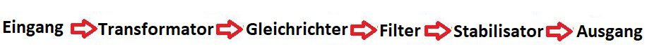 Im Folgenden wird ein Netzteil mit Gleichspannungsstabilisierung behandelt, das die Aufgabe hat, dafür zu sorgen, dass der Wert der Ausgangsspannung bei Änderungen der Eingangsspannung des Netzteils und bei Änderungen des vom versorgten Gerät aufgenommenen Stroms unverändert bleibt. Der einfachste Typ eines solchen Netzteils ist ein Transformator-Netzteil, dessen Blockschema in Form von zusammengeschalteten Funktionsblöcken dargestellt werden kann.