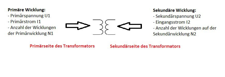 Die Größen, die sich auf die Primärseite des Transformators beziehen, werden in der Regel als Primärgrößen bezeichnet (Primärspannung U1, Primärstrom I1, Anzahl der Windungen der Primärwicklung N1), während die Größen, die sich auf die Sekundärwicklung beziehen, als Sekundärgrößen bezeichnet werden (Sekundärspannung U2, Sekundärstrom I2, Anzahl der Windungen der Sekundärwicklung N2).