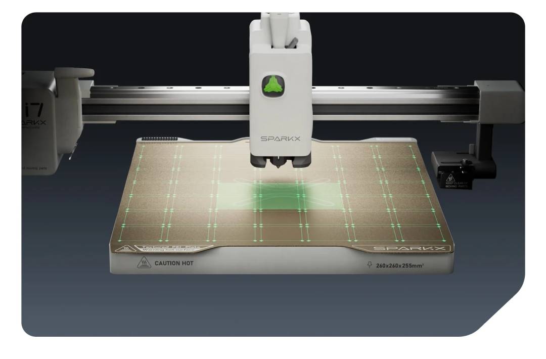 Der Drucker bietet einen großzügigen Arbeitsbereich von 260 x 260 x 255 mm, der sowohl für große Modelle als auch für komplexe mehrteilige Drucke geeignet ist. Der SparkX i7 unterstützt die gängigsten Materialien - PLA, PETG, TPU und PLA-CF- und bietet damit Vielseitigkeit und Anpassungsfähigkeit für eine Vielzahl von Anwendungen. Er unterstützt Filamente mit einem Durchmesser von 1,75 mm und kann mit Düsen von 0,2 mm bis 0,8 mm arbeiten, sodass Sie zwischen Präzisions- und Hochgeschwindigkeitsdruck wählen können.