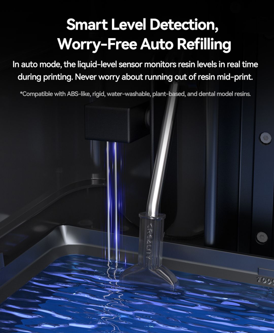 Das Modul ist mit einem fortschrittlichen Harzfüllstandsüberwachungssystem ausgestattet, das den Tank automatisch auffüllt, sobald der Füllstand unter den erforderlichen Mindestwert sinkt. Dies trägt dazu bei, Unterbrechungen zu vermeiden und einen reibungslosen Druckvorgang zu gewährleisten. Für lange und anspruchsvolle Projekte ist dies eine unverzichtbare Funktion.