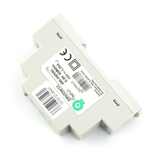 Netzteil für DIN-Schienenmontage . Die Eingangsspannung des Netzteils beträgt 200 V bis 240 V AC und die Ausgangsspannung 12 V. Der Ausgangsstrom beträgt bis zu 1,25 A.