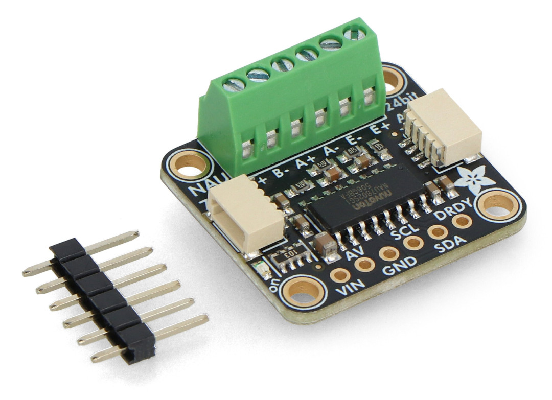 Ein Modul von Adafruit mit dem NAU7802 Chip zum Auslesen von Daten aus Dehnungsmessstreifen. Es enthält einen 24-Bit-Differential-ADC mit sehr hoher Auflösung, mit zusätzlichen Verstärkungs- und Kalibrierungsschaltungen. Wenn das Modul an die Mikrocontrollerplatine angeschlossen ist, kann die Widerstandsänderung des Balkens gelesen werden, und nach der Kalibrierung kann eine genaue Gewichtsmessung vorgenommen werden. Die Platine ist mit Qwiic-Anschlüssen, gelöteten Schraubanschlüssen und Lötfeldanschlüssen für die Doldpinleiste ausgestattet.