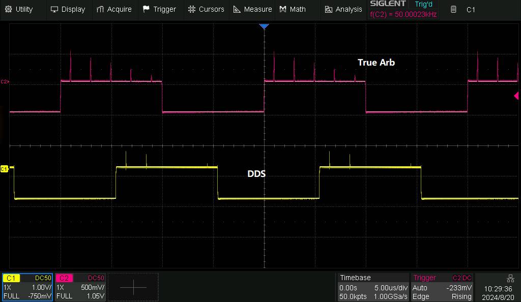 Die im SDG1062X Plus implementierte TrueArb-Technologie ermöglicht die Erzeugung von Arbiträrsignalen mit voller Präzision für jeden Punkt. Im Gegensatz zu klassischen DDS-Generatoren arbeitet TrueArb in einer Punkt-für-Punkt-Architektur und eliminiert Interpolationsfehler und Jitter, was zu einer außergewöhnlichen Signaltreue führt. Die Technologie erzeugt Signale von 24 Mpts bis 8 Mpts bei Abtastraten von bis zu 250 MSa/s.