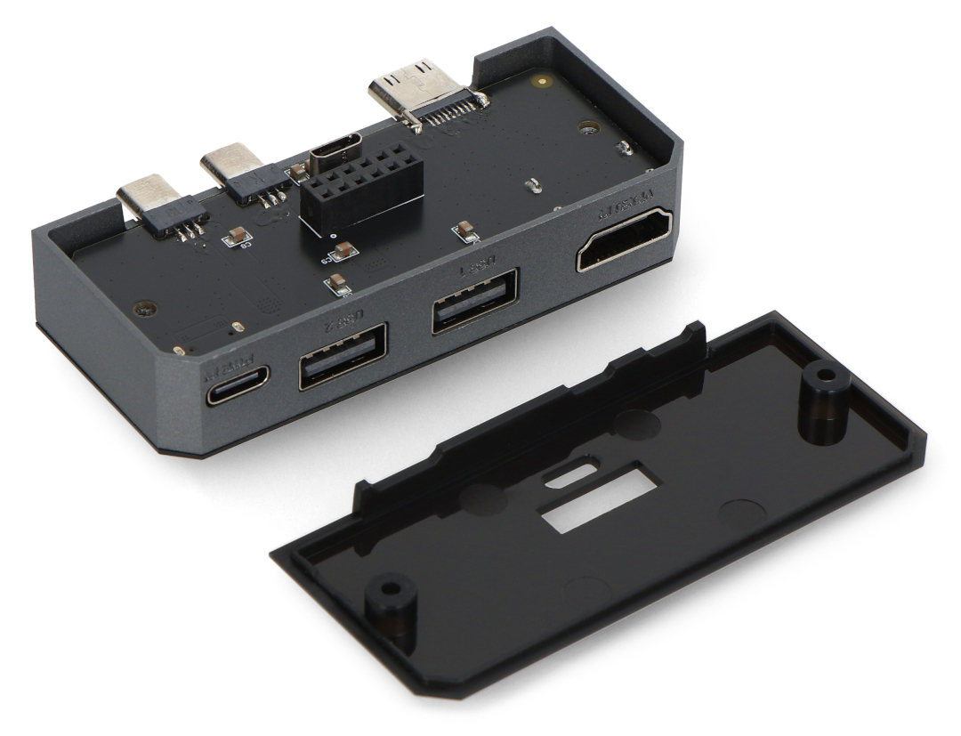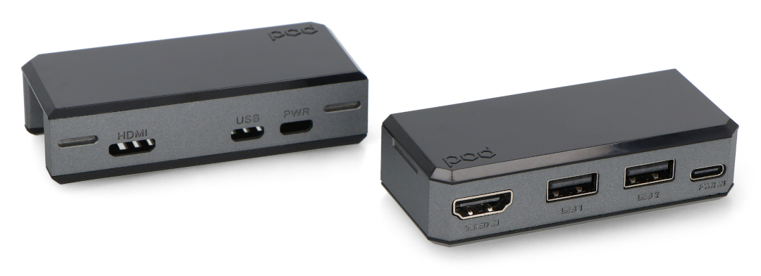 Ein Kit bestehend aus zwei Teilen aus der Argon POD Reihe - einem Gehäuse und einem HDMI USB Hub Modul für den Raspberry Pi Zero 2 W. Das Argon POD-Gehäuse ist aus Aluminium und ABS in den Farben Schwarz und Graphit gefertigt. Dank seines Designs fungiert es auch als Kühlkörper, um die Wärme des Minicomputers Raspberry Pi Zero 2 W effektiv abzuleiten. Das Gehäuse ermöglicht außerdem den nahtlosen Anschluss des HDMI-USB-Hub-Moduls. Dieses Modul erweitert die Anschlüsse des Minicomputers um zwei zusätzliche USB-Typ-A-Anschlüsse, eine HDMI-Buchse und USB-C.