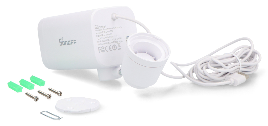 Die Sonoff CAM-B1P ist für die Wandmontage an einer Gebäudefassade oder unter einem Vordach konzipiert. Befestigungsstifte und Schrauben für eine stabile Montage des Geräts sind im Lieferumfang enthalten. Die Stromversorgung der Kamera erfolgt mit 5 V / 2 A über eine USB Typ A Schnittstelle. Die Konfiguration erfolgt über die eWeLink-App, nachdem die Reset-Taste 5 Sekunden lang gedrückt wurde und eine Verbindung zu einem 2,4-GHz-WLAN-Netzwerk hergestellt wurde.
