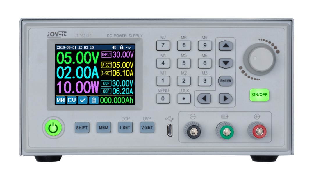 Das Joy-IT PS1440-C-Pro ist ein modernes, programmierbares Labornetzteil, das eine präzise Spannungsregelung von 0,01 V bis 60 V und eine Stromregelung von 0,01 A bis 24 A bietet. Mit einer Ausgangsleistung von 1440 W bewährt sich das Netzteil sowohl beim Testen elektronischer Geräte als auch beim Laden von Batterien. Die Bedienung erfolgt über ein intuitives Bedienfeld mit Tastatur und Drehknopf, und alle Einstellungen werden auf dem 2, 4-Zoll-Farbdisplay übersichtlich dargestellt. Bei diesem Modell können bis zu neun Spannungsprofile gespeichert werden und die integrierte RS485-Schnittstelle sorgt für die Kommunikation über große Entfernungen. Das PS1440-C-Pro bietet außerdem einen umfangreichen Schutz, einschließlich Überstrom- und Überspannungsschutz.