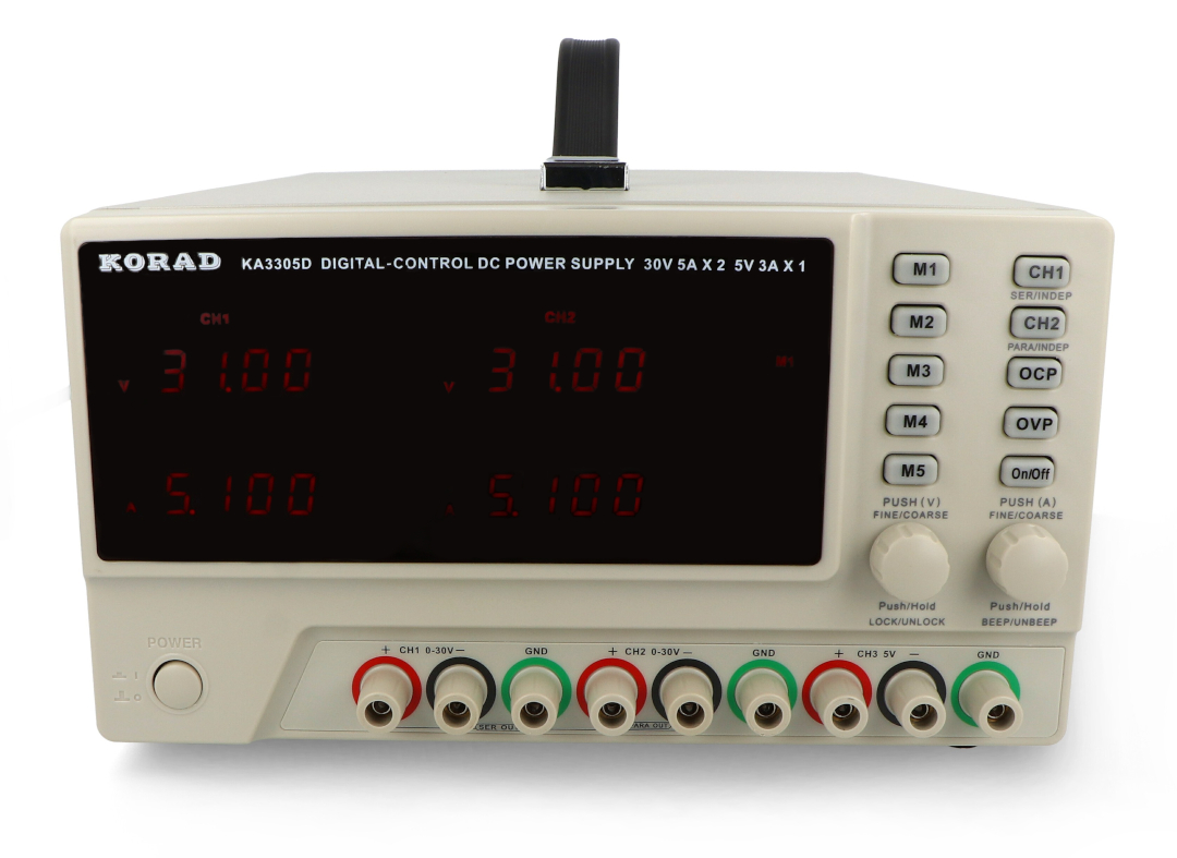 Das 3in1-Netzgerät Korad KA3305D 2x 0-30V/0-5A + 1x 5V/3A ist ein dreifaches Labornetzgerät mit digitaler Programmierung der am häufigsten verwendeten Einstellungen. Die Ausgangsparameter werden über zwei Druckknöpfe stufenlos eingestellt, wobei zwischen Grob- und Feineinstellung umgeschaltet werden kann.