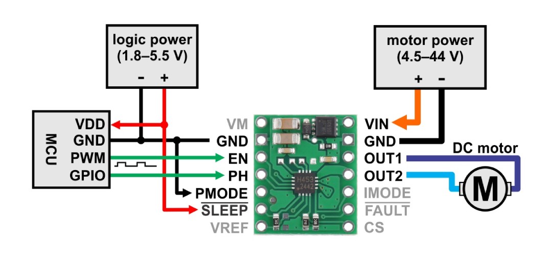 Der Anschluss des TB67H453FTG-Treibers ist einfach und intuitiv. Verbinden Sie die Motorversorgungsspannung mit dem VIN-Pin und die Masse mit GND, das mit der Steuerlogik geteilt werden muss. Die Ausgänge OUT1 und OUT2 werden direkt mit den Klemmen des Bürstenmotors verbunden. Die Pins EN / IN1 und PH / IN2 werden zur Steuerung von Richtung und Geschwindigkeit mit PWM-Signalen oder im Phasen-/Enable-Modus verwendet. Der PMODE-Pin legt den Betriebsmodus des Reglers fest, während der SLEEP-Pin das Gerät in den Schlafmodus versetzt. Die Pins VREF und IMODE ermöglichen die Einstellung der Strombegrenzung, und der CS-Pin bietet die Möglichkeit, den Motorstrom zu überwachen. Wird ein Fehler erkannt, meldet der FAULT-Pin ein Warnsignal, das vom Mikrocontroller überwacht wird.