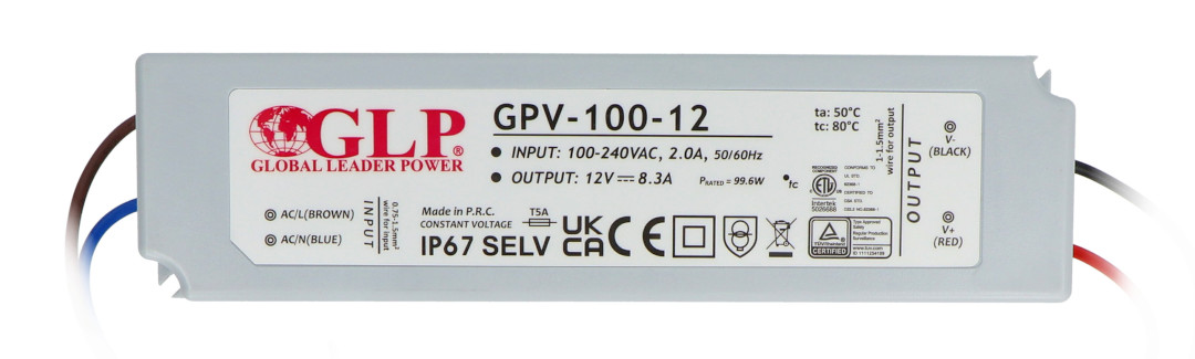Produktbeschreibung: Wasserdichtes Netzteil für LED-Streifen und Bänder GPV-100-12 - 12V / 8,3A / 100W