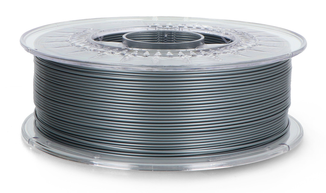 Silbernes PLA-Filament von Devil Design - thermoplastisches Polyester in Form von Fasern , das in Druckstiften und 3D-Druckern verwendet wird. Das Materialgewicht auf der Spule beträgt 1 kg netto . Das Filament wurde mit einem Feuchtigkeitsabsorber vakuumverpackt.