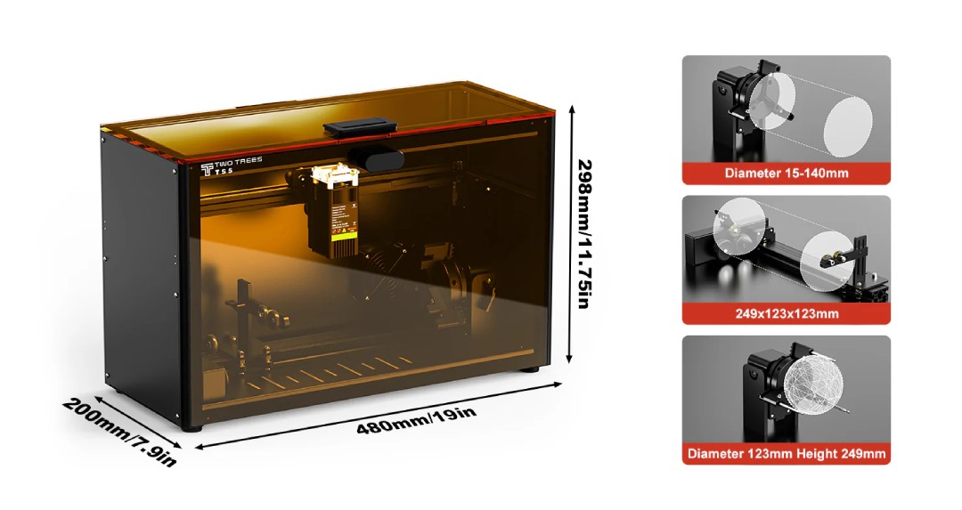 Die TS5 ist mit einem 4-in-1-Rotationsmodul ausgestattet, das die präzise Gravur einer Vielzahl von Objekten ermöglicht - von Gläsern bis zu Ringen. Jeder Modus ist einfach zu installieren und an eine bestimmte Art von Oberfläche angepasst: