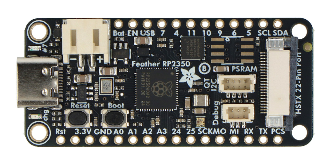 Die Platine bietet 29 GPIO-Pins, von denen 21 auf den Standard-Feather-Anschluss und weitere acht auf den HSTX-Anschluss entfallen. Jeder Pin hat eine Reihe von alternativen Funktionen, einschließlich PWM, UART, I2C und SPI. Die Analogeingänge A0-A3 verwenden 12-Bit-ADCs. Der STEMMA QT-Anschluss (JST SH 4-polig) ermöglicht eine einfache Integration von I2C-Sensoren ohne Löten. Der USB-Typ-C-Anschluss wird sowohl für die Stromversorgung als auch für die Programmierung verwendet, und der SWD-Anschluss (JST SH 3-polig) ermöglicht das Debugging. BAT-, USB- und 3,3-V-Ausgänge sind ebenfalls verfügbar, mit der Möglichkeit, den Batteriestatus über einen Widerstandsteiler zu überwachen.