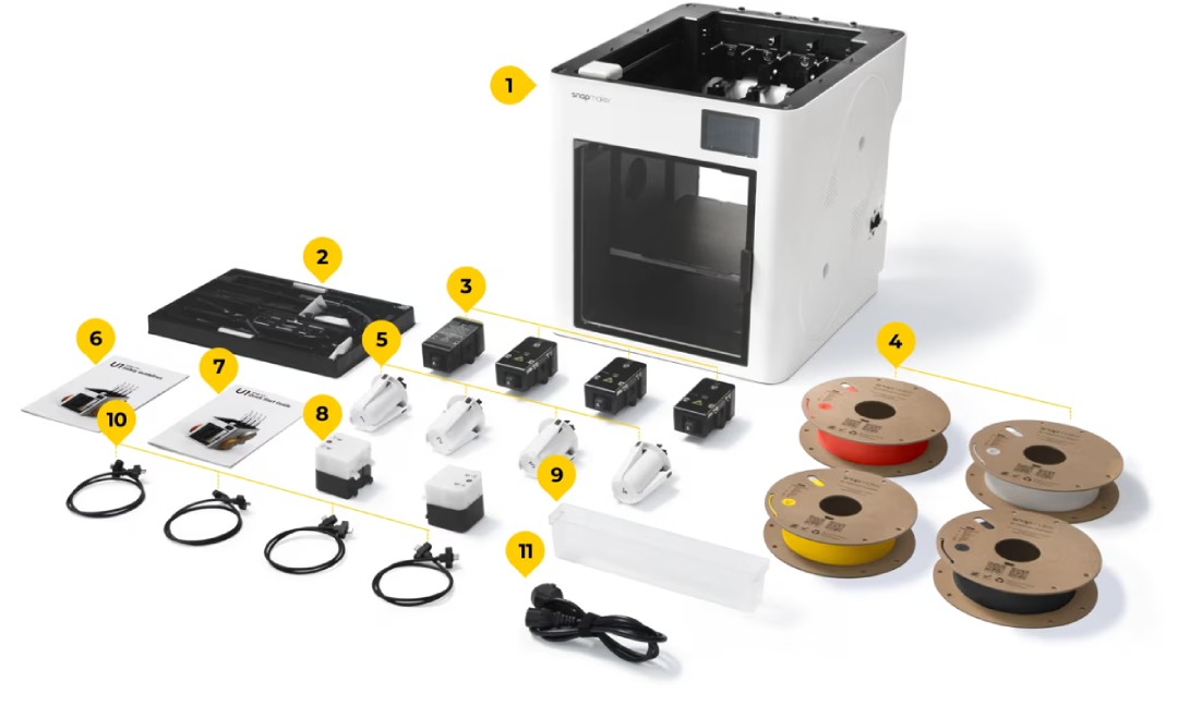 Jeder Kopf wird mit Präzisionskugelkupplungen arretiert, die mehr als 1.000.000 Testzyklen ohne Ausfall durchlaufen haben. Die Konstruktion des Druckers besteht aus langlebigen, robusten Materialien, die auch bei sehr hohen Druckgeschwindigkeiten Stabilität und Qualität gewährleisten. Der U1 wird mit einem umfassenden Starter-Kit geliefert, das 4 Druckköpfe, 4 PLA-Spulen, Halterungen, Kabel und Werkzeuge enthält. Es ist ein komplettes, sofort einsatzbereites Gerät, das für einen langfristigen Betrieb ohne unnötige Ausfallzeiten konzipiert ist.