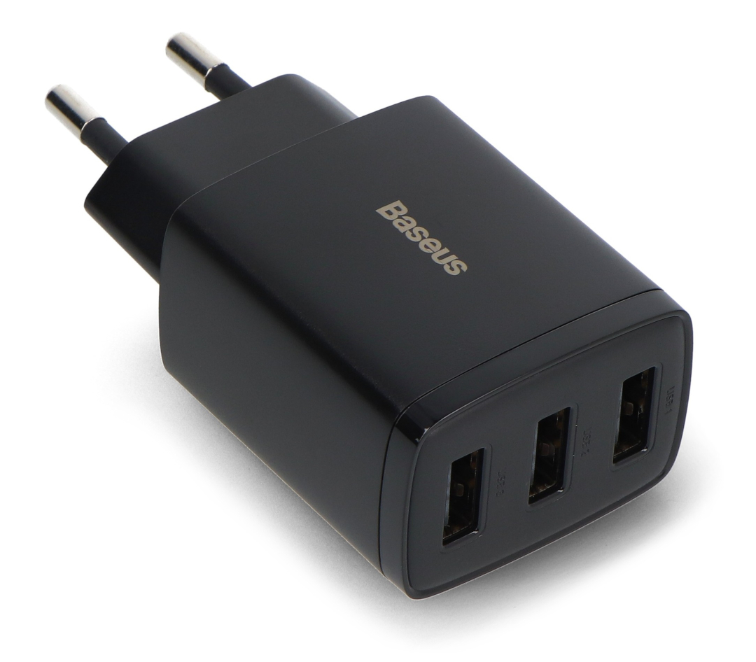 Produktbeschreibung: Baseus Kompaktes Schnellladegerät mit 3 USB-A-Anschlüssen – 5 V / 3,4 A 17 W – Schwarz