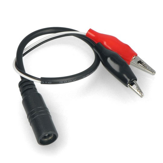 Das Netzkabel endet auf der einen Seite mit einer 2,1/5,5-mm-DC-Netzbuchse, auf der anderen Seite mit gängigen Krokodilklemmen. Es ermöglicht, dass die Spannung vom Netzteil für jeden Anschluss abgeleitet wird. Die Länge der Krokodilklemme beträgt 27 mm und das Kabel 30 cm.