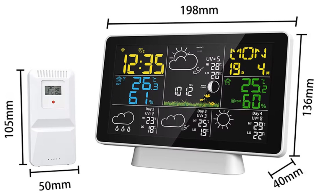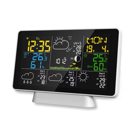 Der HD-Farb-LCD-Bildschirm zeigt Temperatur, Luftfeuchtigkeit, Luftdruck, Mondphasen, Wettervorhersage sowie Uhrzeit und Kalender an.Besondere Merkmale