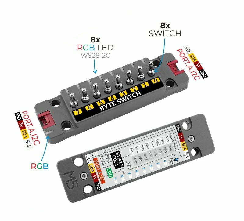 Die Unit ByteSwitch von M5Stack ist ein fortschrittliches Eingangsmodul, das auf dem STM32G031 Mikrocontroller basiert. Das Board verfügt über 8 unabhängige bistabile Schalter und 9 WS2812C RGB-LEDs, die den Status jedes Eingangs dynamisch anzeigen können. Dank der I2C-Kommunikation und zwei Grove-Anschlüssen (Port.A) können mehrere Module kaskadiert werden, was es ideal für komplexe Anwendungen mit mehreren Eingängen macht. Es ist für den Einsatz mit M5Stack-Controllern konzipiert und wird von UIFlow und der Arduino IDE unterstützt.