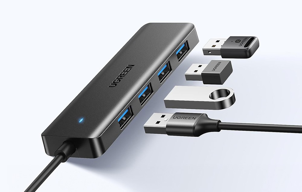 Der Adapter der Marke Ugreen ist ein 4-in-1 Universal-USB-Typ-A-Hub, mit dem Sie schnell und bequem die Anzahl der verfügbaren Anschlüsse an Ihrem Computer oder Laptop erhöhen können. Mit vier USB 3.0-Anschlüssen können Sie mehrere Zubehörteile gleichzeitig anschließen, wie z. B. externe Speichersticks, eine Maus, eine Tastatur, eine Webcam oder einen Drucker, ohne dass Sie die Geräte ständig neu verkabeln müssen. Das Plug-and-Play-Design bedeutet, dass der Adapter sofort nach dem Einstecken betriebsbereit ist, ohne dass Treiber oder Software installiert werden müssen. Das Gerät wurde für maximale Benutzerfreundlichkeit und Mobilität entwickelt. Mit einem kompakten Formfaktor von nur 0,4 Zoll und einem Gewicht von 33 g können Sie den Hub überallhin mitnehmen - zur Arbeit, auf Reisen oder in die Universität. Er ist ein unverzichtbares Zubehör für alle, die zusätzliche USB-Anschlüsse für die tägliche Arbeit und Unterhaltung benötigen.