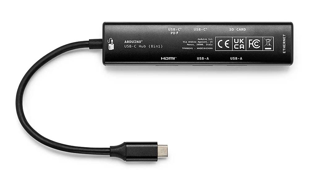 Der Arduino USB-C Hub 8-in-1 wurde entwickelt, um die Möglichkeiten von Arduino-Boards und anderen Geräten mit USB-Typ-C- Anschluss optimal zu nutzen. Dank integrierter HDMI-, Ethernet-, USB- und Speicherkartenleser lässt sich eine voll funktionsfähige Arbeitsumgebung schaffen. Der Hub unterstützt 4K-Auflösung mit 30 Hz , schnelle Datenübertragungsraten von bis zu 5 Gbit/s und eine Stromversorgung von bis zu 65 W. Durch Plug-and-Play und die volle Kompatibilität mit Windows-, macOS- und Linux-Systemen ist er sofort einsatzbereit – ganz ohne Treiberinstallation. Das schlanke, schwarze Gehäuse mit einem Gewicht von nur 60 g macht den Hub extrem portabel, und das integrierte 175-mm-Kabel ermöglicht eine flexible Platzierung auf Ihrem Arbeitsplatz.