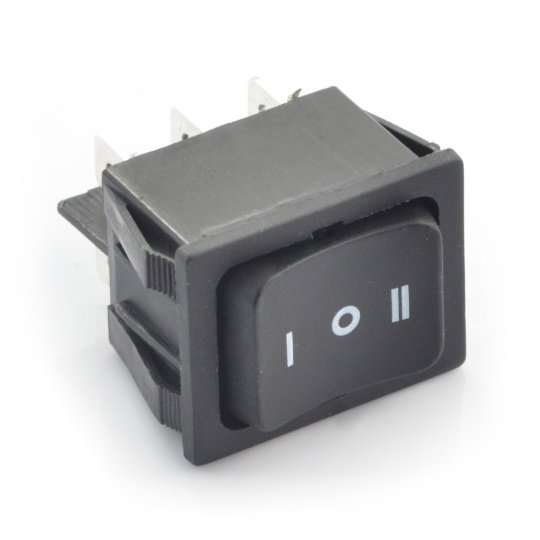 Wippschalter , tastend, zwei Stellungen. Ausgestattet mit 6 Kontakten mit einer Belastbarkeit von 15 A und 230 V. Der Stiftabstand beträgt 9 mm, Die Abmessungen des Schalters betragen 33 x 30 x 24 mm.