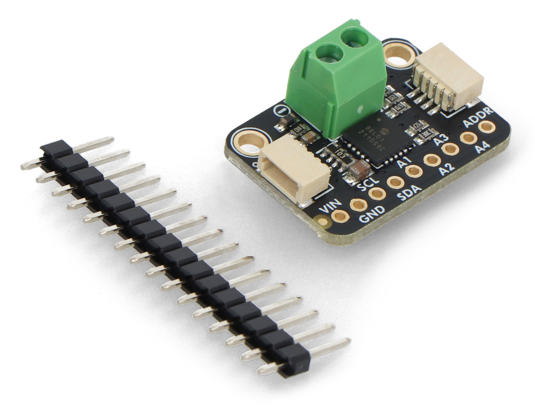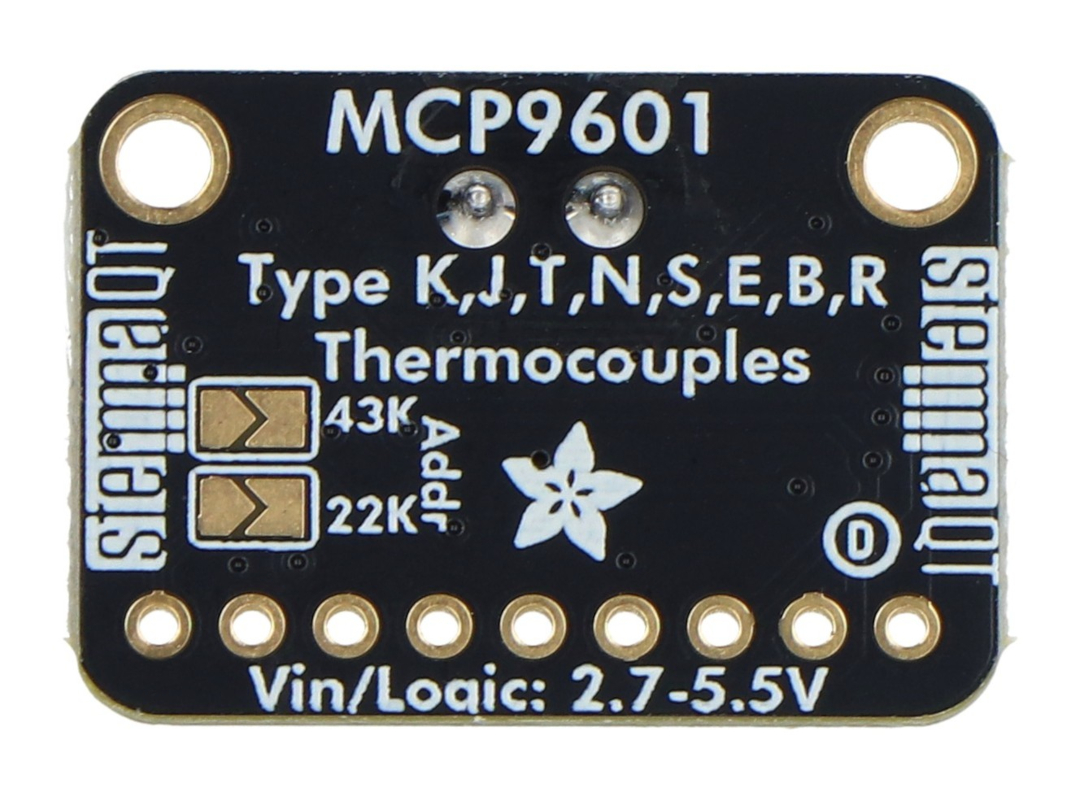 Dieses von Adafruit hergestellte Modul verfügt über einen integrierten MCP9601 -Chip. Es besitzt zwei Qwiic-Anschlüsse und unterstützt acht Thermoelementtypen: K, J, T, N, S, E, B und R (deren Messbereiche in den Produktspezifikationen aufgeführt sind). Das Modul ist mit jedem Mikrocontroller oder System mit I²C-Kommunikation kompatibel. Es ermöglicht zudem die Einrichtung von Warnmeldungen bei Temperaturanstiegen oder -abfällen.